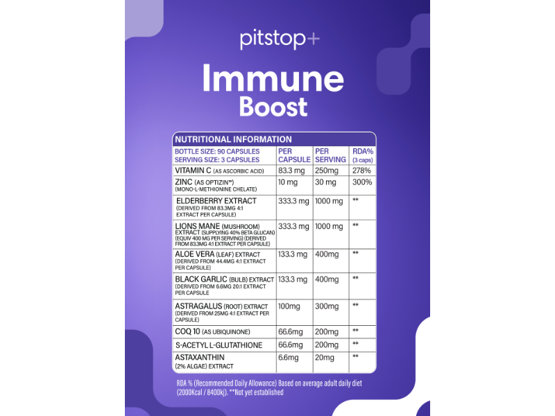 Pitstop+ Immune Boost combines key vitamins, minerals and functional compounds with plant extracts and antioxidants to provide broad-spectrum support. With a multi-dosed formula delivering ingredients such as Vitamin C, Zinc, elderberry, Lion’s Mane and black garlic, it’s built for consistent, daily use.
